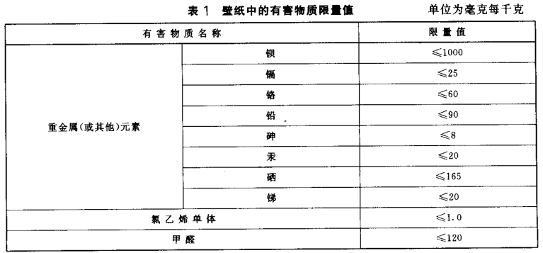 壁纸中的有害物质限量值应符合表 1规定。