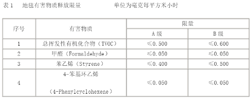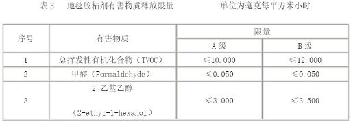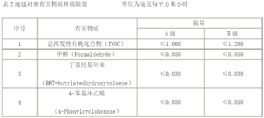 限量及分级规定地毯、地毯衬垫及地毯胶粘剂有害物质释放限量应符合表 1、表2、表3的规定